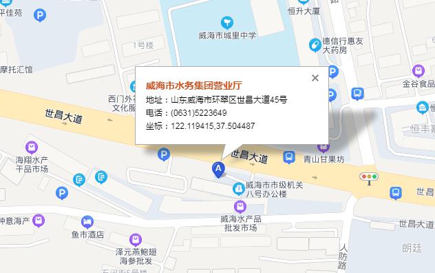 服務電話:0631-5223649 地址:環(huán)翠區(qū)世昌大道45號市級機關(guān)八號樓 營業(yè)時間:周一至周五8:30—17:00(法定節(jié)假日除外) 服務內(nèi)容:水費收取、更名過戶、變更賬號、一戶多人口用水申請、變更用水性質(zhì)、校表、報修、報停、申請電子發(fā)票;接水報裝業(yè)務咨詢、受理;水電氣暖通信廣電一窗辦理