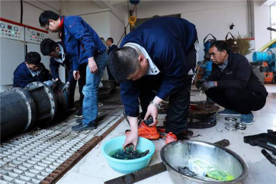 濱海新城污水管道修好后,梁玉棟又驅(qū)車前往張村泵站,現(xiàn)場指導設備維修。前些日子,張村泵站的潛水排污泵因機封出現(xiàn)問題,導致設備進水報警。機器維修說起來簡單,但有時為了換零部件,需要將機器全部拆開再重新組裝,這對維修人員技術水平要求很高。如果污水蓄水池底部滑道等出現(xiàn)問題,還需要用氣囊封堵污水管道,遇到泵站停機維修或者大的管網(wǎng)搶修時,為確保過程中污水不會溢流,還要在開工之前研究出一整套合理的解決方案,有些難度較大的搶修工作通常一干就需要幾個通宵。