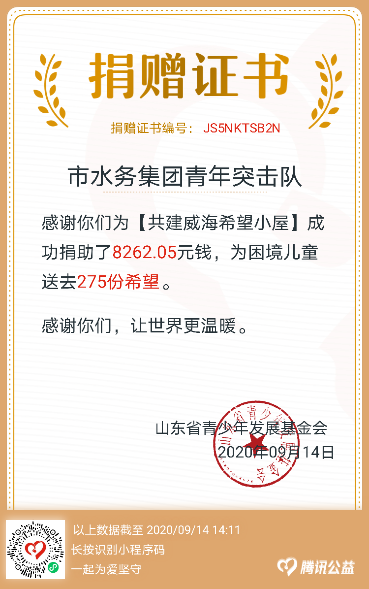 日前,威海團(tuán)市委發(fā)起共建威海“希望小屋”公益日活動(dòng),幫助困境兒童改善學(xué)居環(huán)境?;顒?dòng)一經(jīng)發(fā)起,集團(tuán)公司廣大黨員、團(tuán)員、職工積極響應(yīng)、踴躍捐款,短短三天時(shí)間,累計(jì)捐款8200余元。
